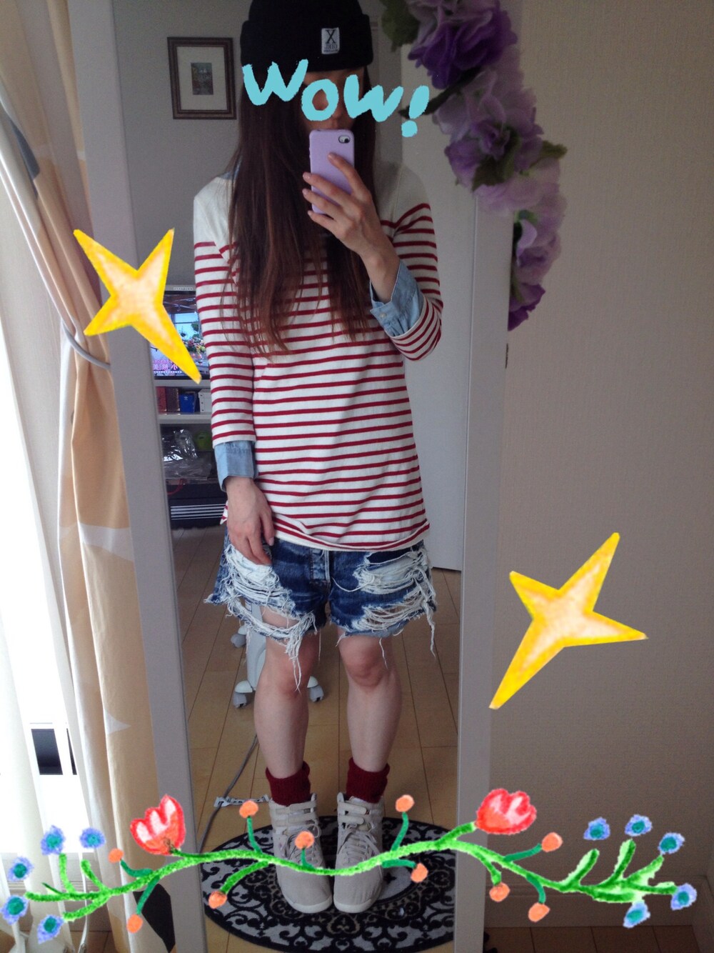 トップス:UNIQLO シャツ:UNIQLO パンツ:RNA 靴下:靴下屋 靴:Reebok ビーニー:X-girl