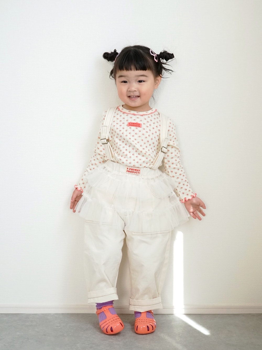 White × Pink チュールが可愛すぎて どんなコーデにも合わせたくなる🤭 サスペンダー付きワイドデニム シンプルコーデに合わせるのお気に入り💓 p.premierさんの靴下、 自然とくしゅっと感出せて めちゃくちゃおすすめ☝️ サンダルもプチプラで カラバリ豊富だから 他の色も欲しい〜♡ 🧒95㎝/14㎏