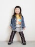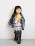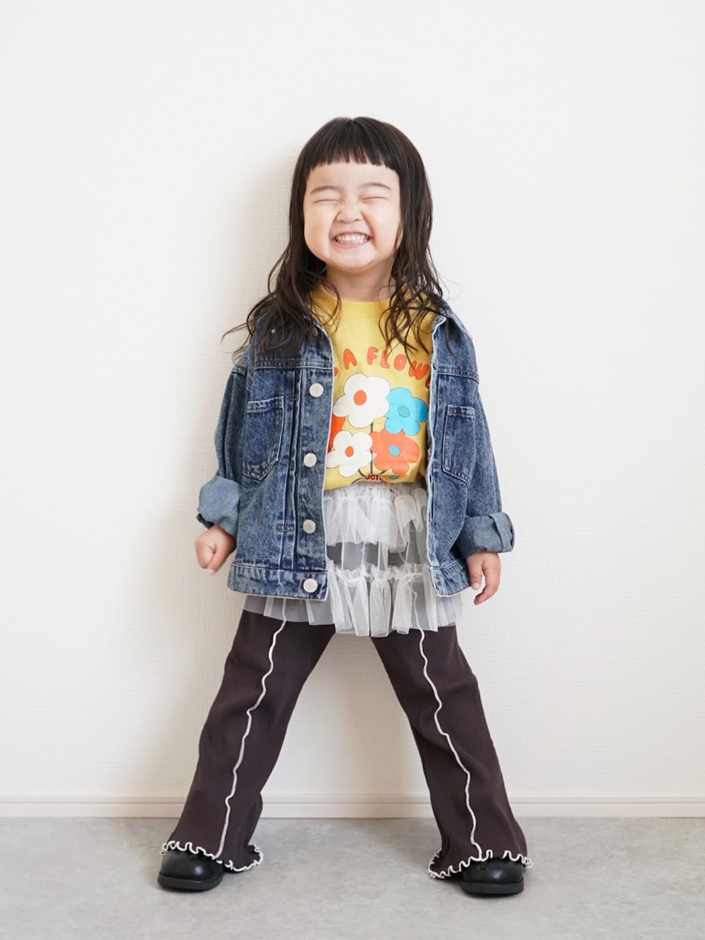 デニムジャケットが 重宝する季節🌸 柔らかいデニムなので 動きにくいとかはなさそう🙆♀️ Tシャツはカラーものあると シンプルコーデのポイントに🟡 このチュール万能すぎるよ😍✨ メロウのフレアパンツは 合わせやすいブラックにしたけど 脚長効果すごい🤭 🧒95㎝/14㎏