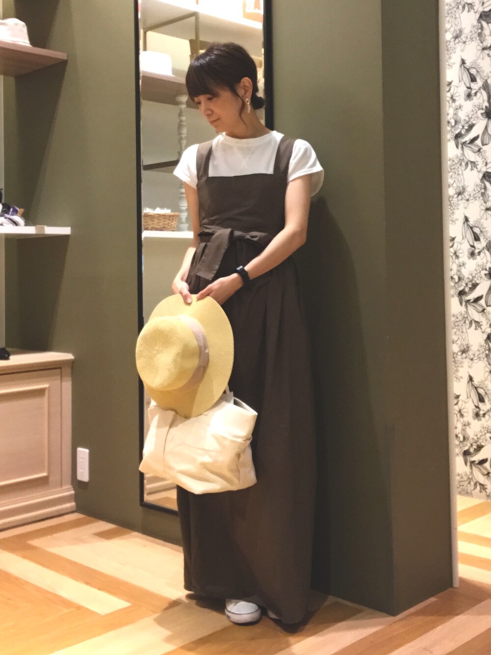マキシ丈のキャミワンピース。 ウエストリボンをバックでもフロントでも結べるので、 その日の気分で雰囲気変えができて◎