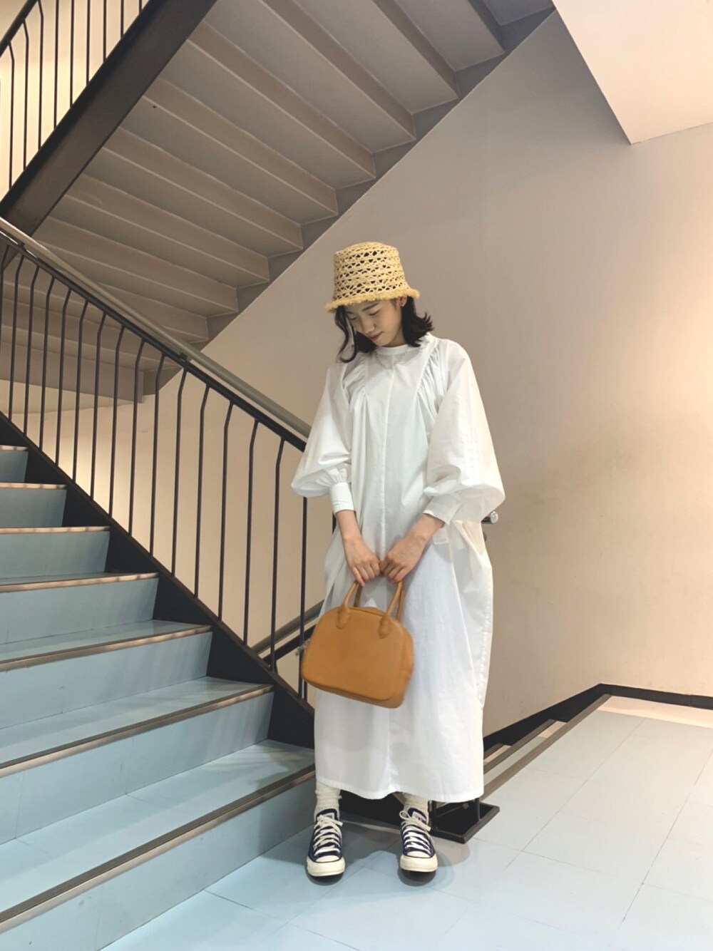 初夏まで着れる薄手の白ワンピース✨ 肩のボリュームが可愛くて ボディーラインはIラインのワンピースなのでボリュームが出過ぎず着れます✨ 麦わらのバケットハットを被るとなお可愛いですよ☺️💕