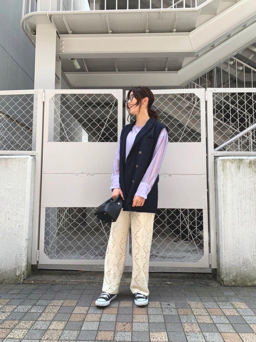色物トップスで大人カジュアルコーデ!! ラベンダーカラーのシャツにレースのパンツを組みあわせて甘めになり過ぎないように大人っぽいネイビーのベストを合わせてみました✨ ラベンダーのシャツはシアー素材で透け感が抑えめで初めての方でも取り入れやすいともいます☺️