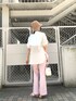 ピンクカラーが可愛く形が綺麗なフレアパンツが登場💕 フレアパンツは色味が4色あってベーシックな黒、白とカラーのピンク、グリーンがあります! 4色あるので好みで楽しんで頂けます✨ フレアの形も細身でかっこよく裾が広がってくれて履くだけでオシャレ感が出ます🥰 トップスは、大きい襟にパイピングがあしらわれていて細かいところまで可愛く作られているアイテムです! 下がシンプルでも上にポイントを持ってこれるのでBIGカラーとてもオススメです✨