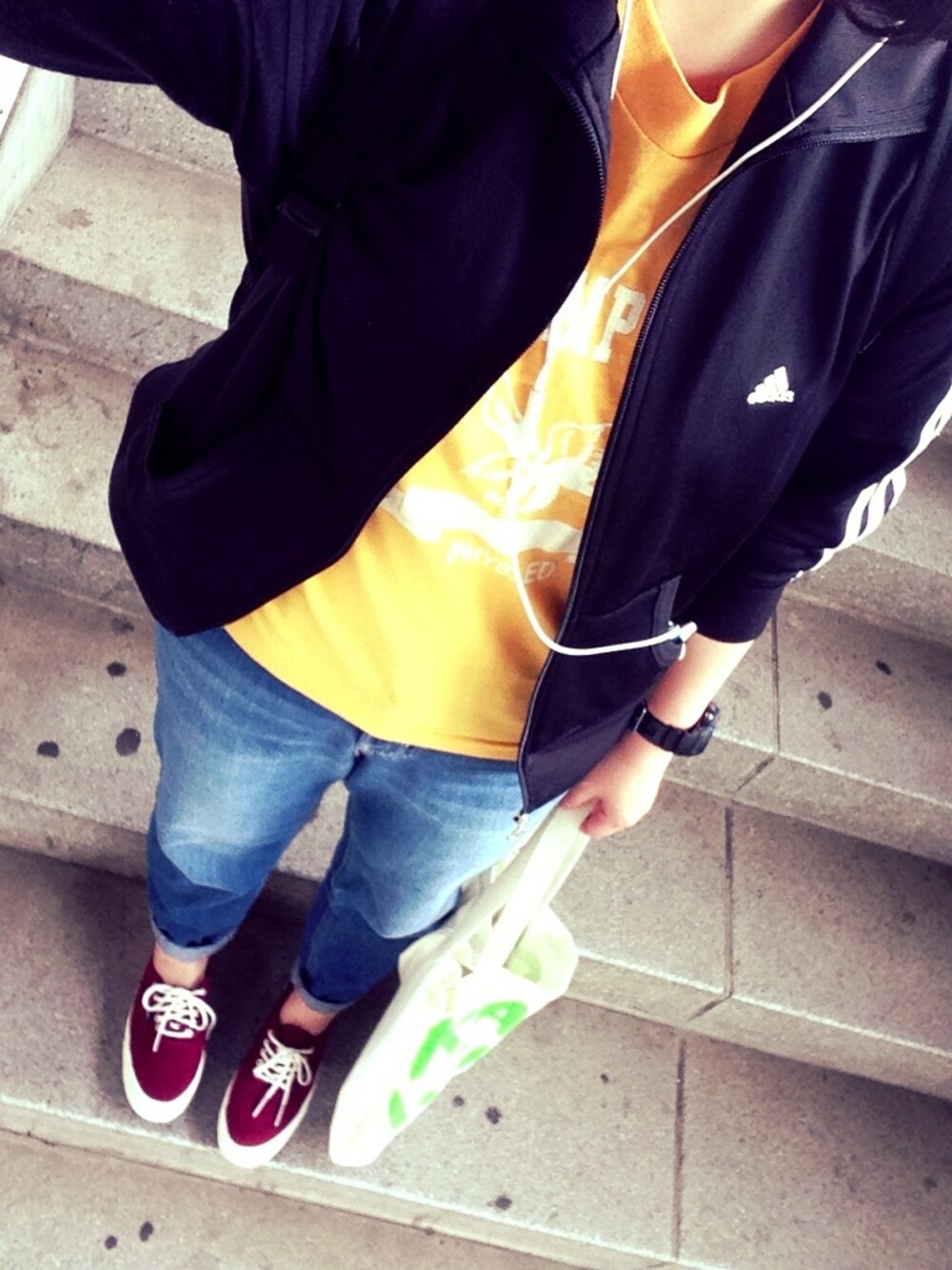 adidasジャージ マスタードカラーT 古着(^O^)/ バッグ/naco PARIS 今日はあんまり調子が 出ないので楽な格好。 いつも以上に。笑 ほんとに最近男の子でも できるような格好ばっかり!(o^^o)