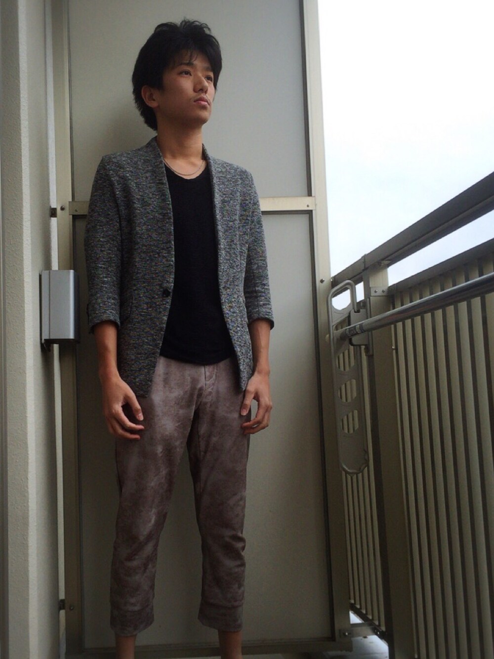 先ほどのカーディガンのかわりに、ノーカラージャケットで合わせました。 こっちの方がパンツの模様がわかりやすいですね。 なかなか面白い模様です(^^) 旅行にこのコーデ使おうかな、