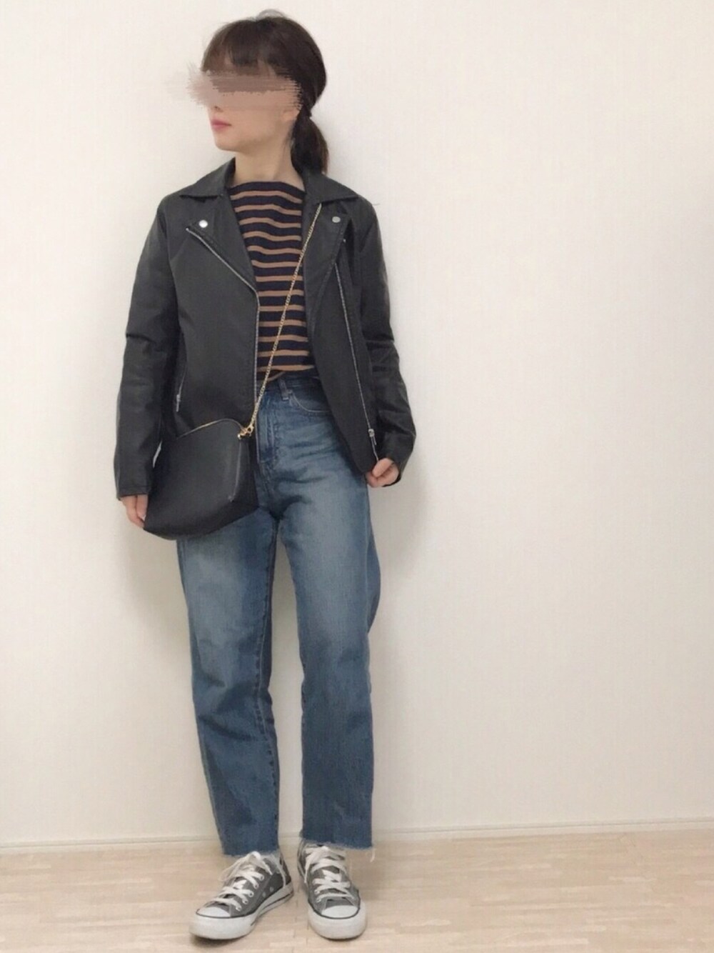 明日のピックアップタグ、ライダース✨ ベージュボーダーに合わせて🌷 このジーナシスのストレートデニム、長いことたくさん着すぎてヨレヨレになってきた🤣