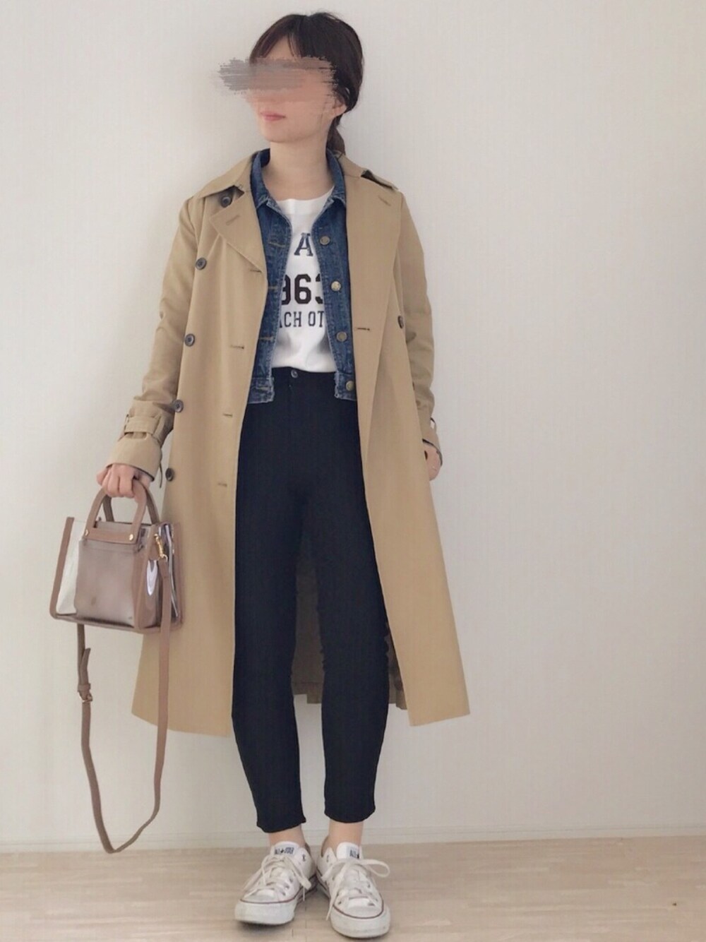 肌寒さ対策に中にGジャン仕込む。アウターオンアウター! 足、太ましい...。 クリアバッグはプチプラで🌷息子を追いかけまわすため、ショルダー付きの2wayで小さめを探していました✨中に巾着入れても絶対かわいい。