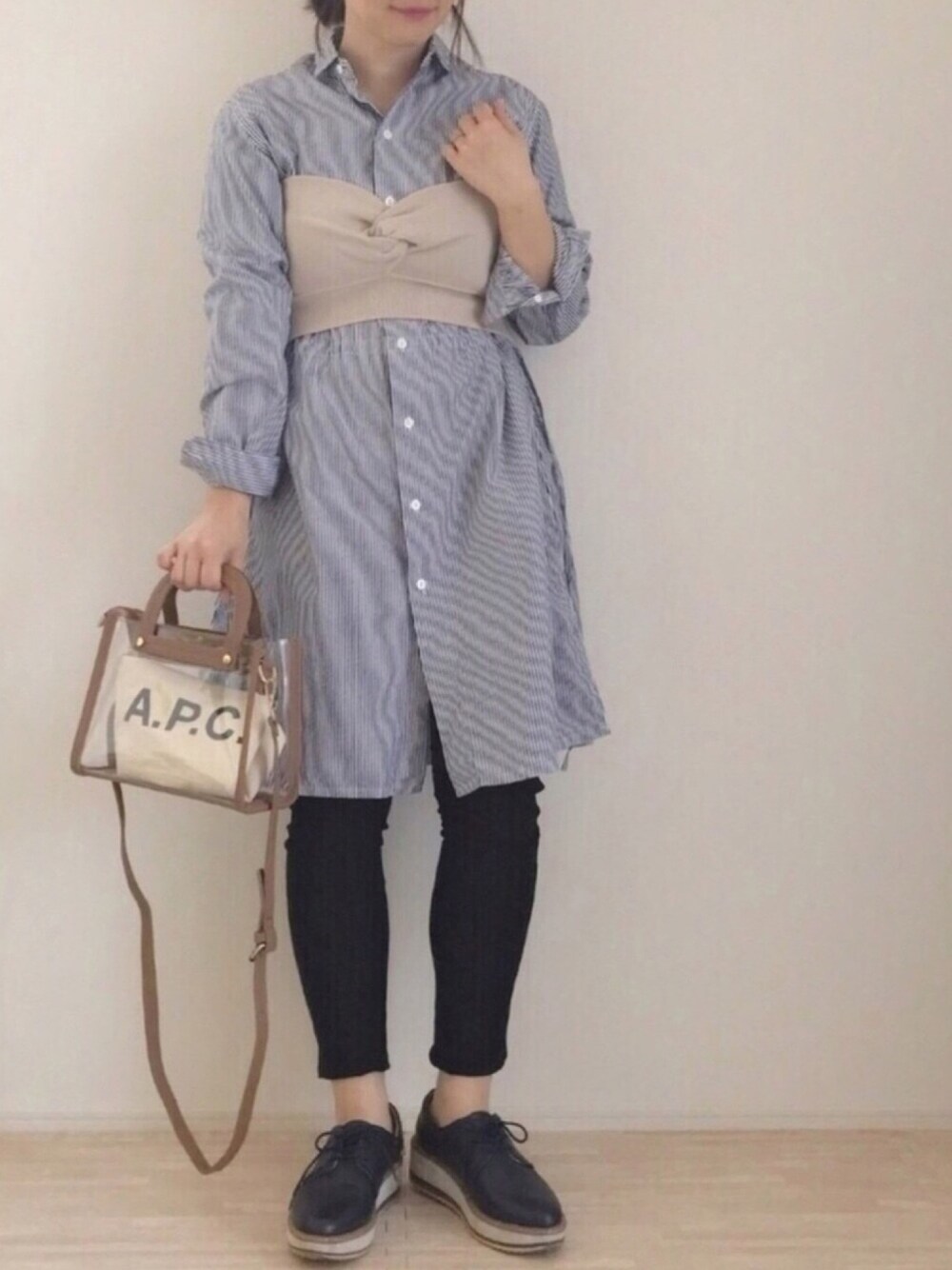 ストライプが変な柄になってる〜〜( ꒪⌓꒪) 細かい柄は撮るといつもこうなる💧 お気に入りストライプワンピースに、ニットビスチェ合わせ♬ ドレスシューズで少しでも脚長効果を狙いたいところ...笑