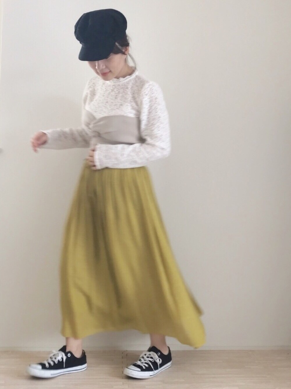 イエローのロングスカートにニットビスチェ🌱 コンバースとキャスケットの黒で引き締めてカジュアル感プラス‼︎