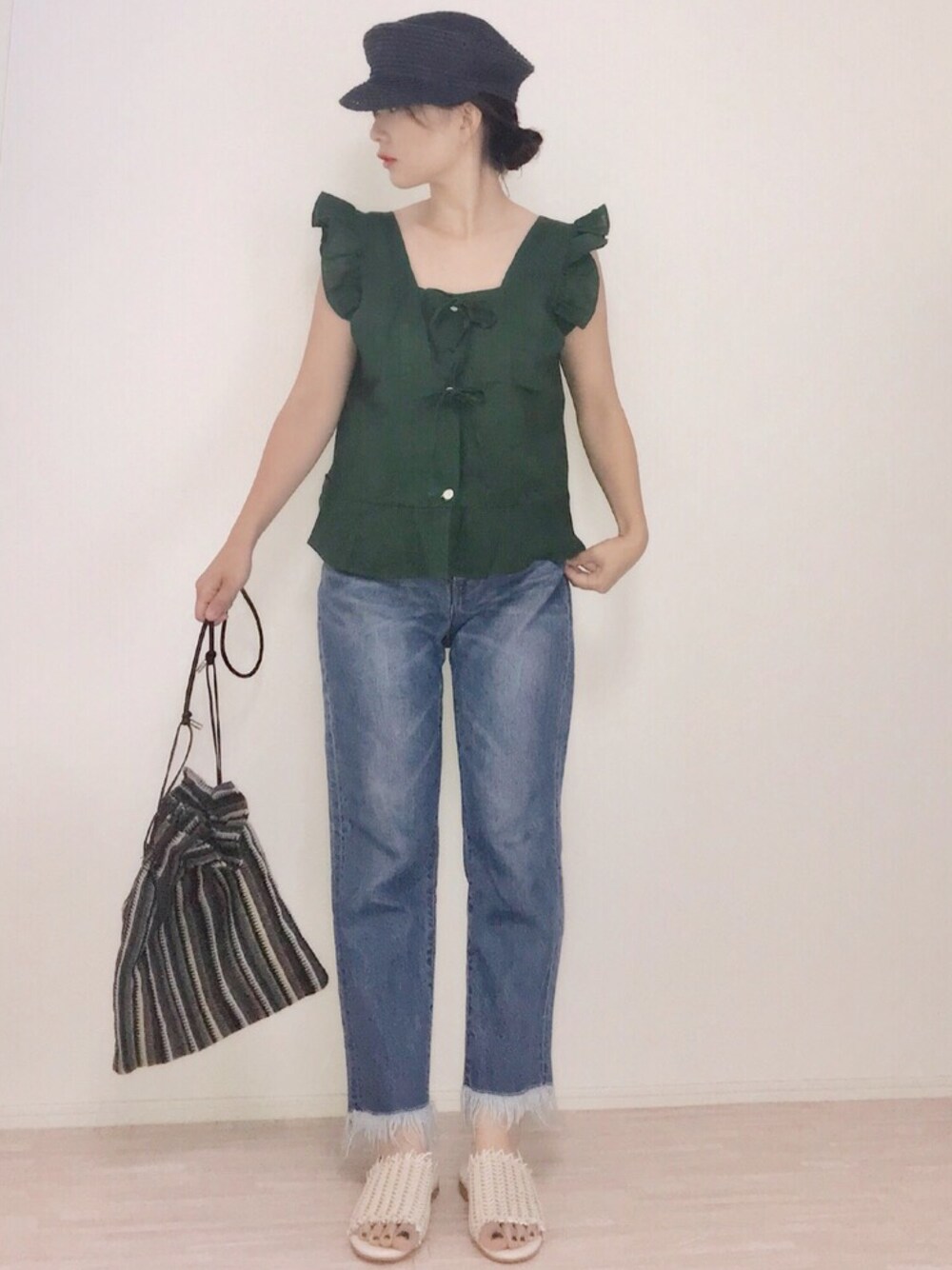 緑のトップスはDHOLICで♡ インしてたけど、トップスそのものがかわいいので出した方が良いことに気がつきました🌼サンダルも編み込んであるデザインで、足元軽く見えていいなぁ。 今日はあっつかったぁー!! 明日からはまた雨に元どおり☂️