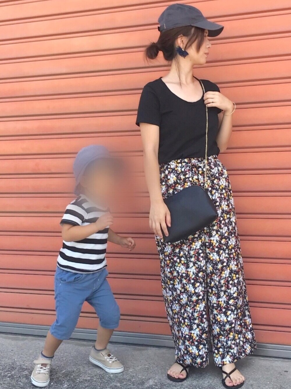ワントーンコーデブラック編! 重たくならないように、TシャツはUネックのもの、足元はなるべく肌が出るサンダル。チェーンバッグと、ブレスレットの華奢目なゴールドで少しポイント✨ 息子がどうしても入って切れないので一緒に。ゴテゴテの柄物、キャラ物は苦手なので、いつもシンプルな格好です。