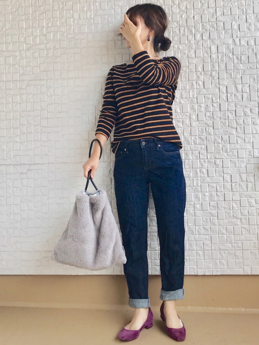 デニムはユニクロ たまには少しきれいめカジュアルな感じで. 足の甲に見えてる白のテープは、初めて出来た魚の目治療中のテーピングです 笑