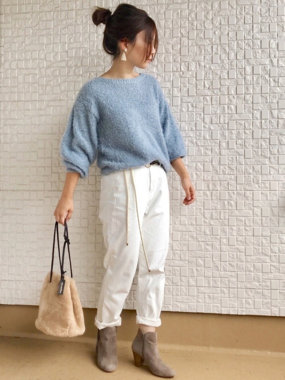ショートブーツのフリンジ部分が可愛いのに、全く写ってない(°ㅂ°) フェザーニットは去年のGU ブルー、ホワイト、ベージュ✨