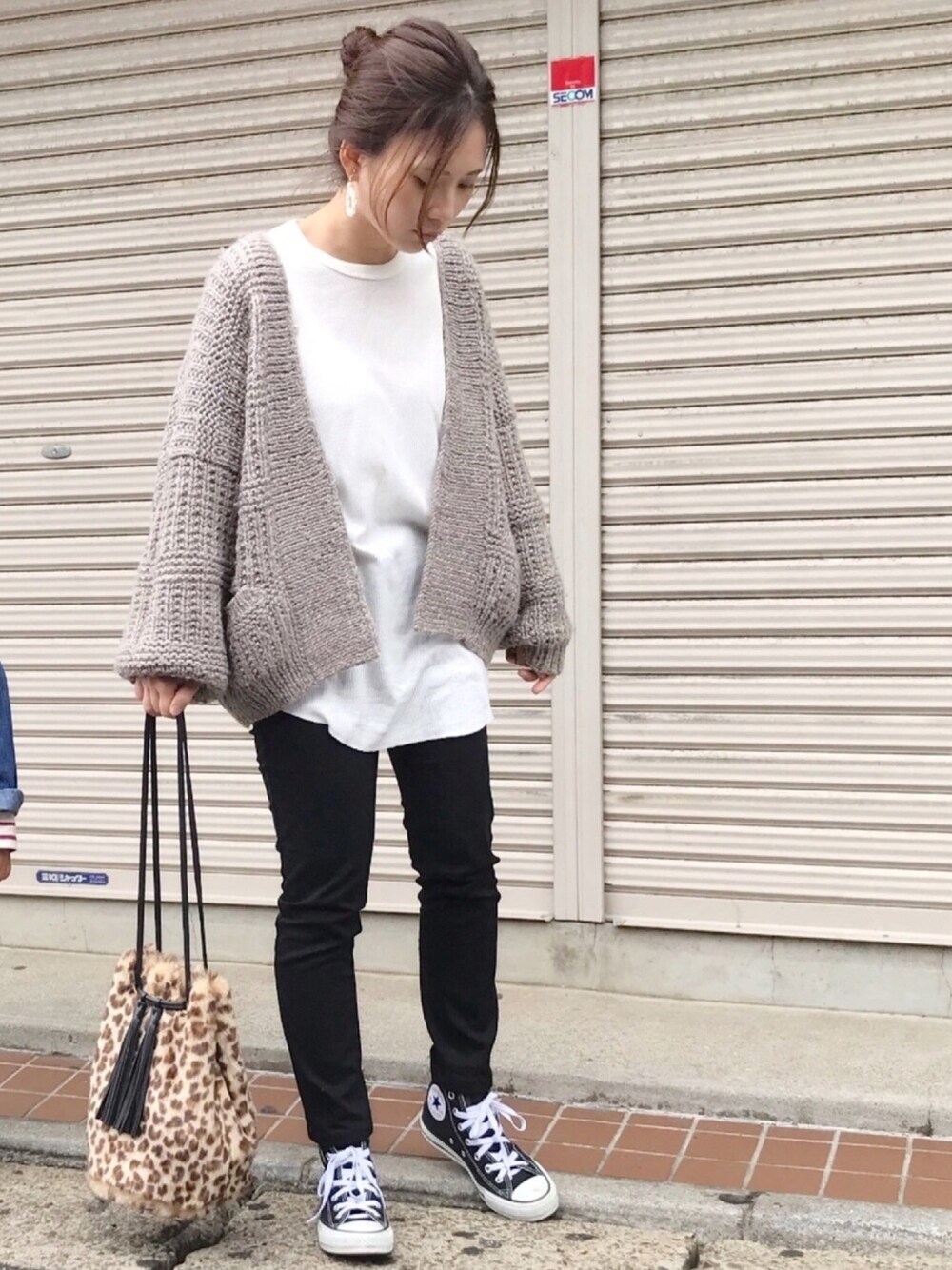 本格的に寒くなってきた! レオパード柄のバッグをポイントにあとはシンプル、ざっくりニットのカーディガンでゆるコーデ。