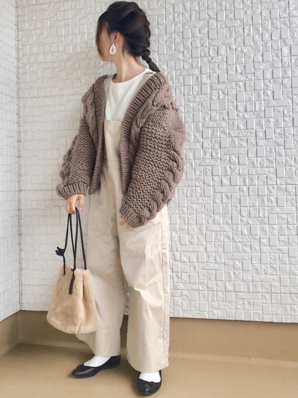 おはようございます。 寒いー!!急に寒くなって体がついていかない!! 大好きなケーブル編みのニットカーディガンをホワイトのサロペットに合わせてみました(*´-`)