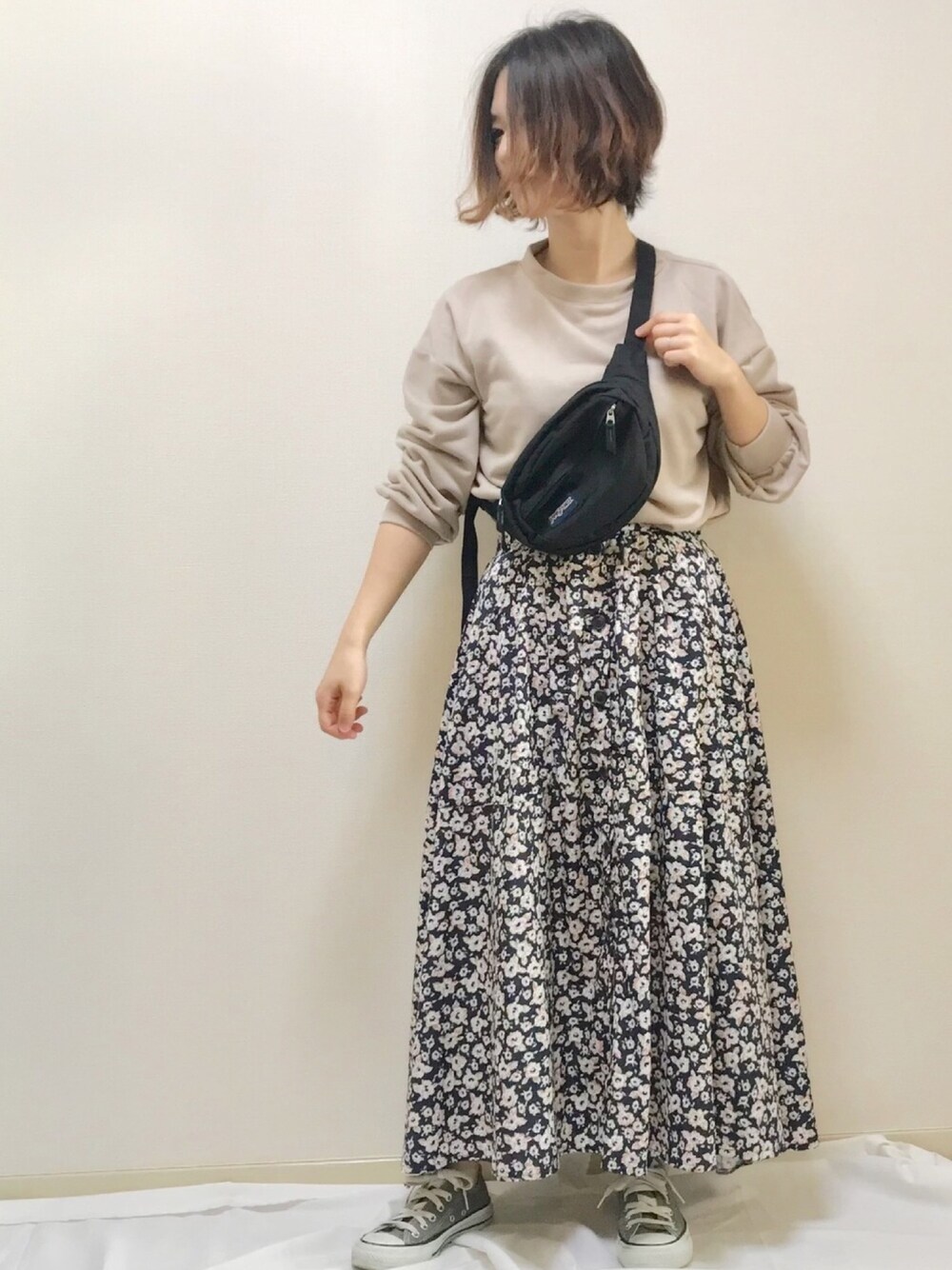このスウェット色違いで3枚買い! 春用のスウェットで薄手で安くて形も可愛い!お得🌸 花柄スカートで鉄板コーデ。