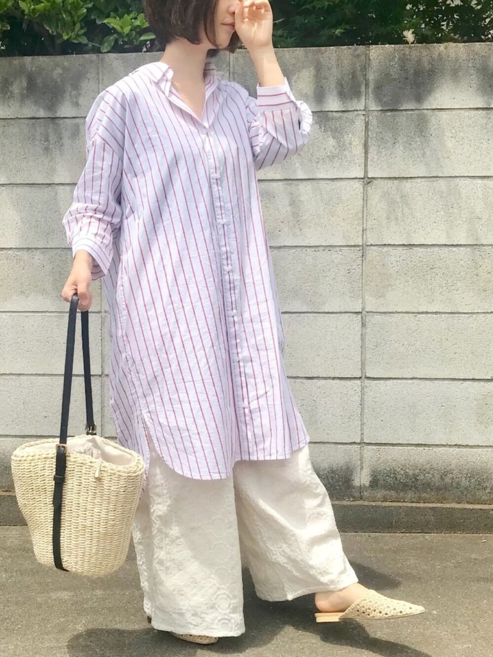 シャツワンピース!!涼しくていい✨ 少しレッドの色入ってるけどオールホワイト意識。