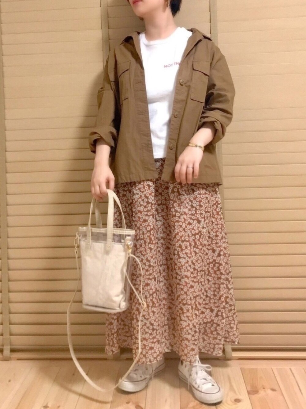 ミリタリーシャツは、数年前のユニクロのメンズXLサイズ! スカートもプチプラとは思えないほど理想✨