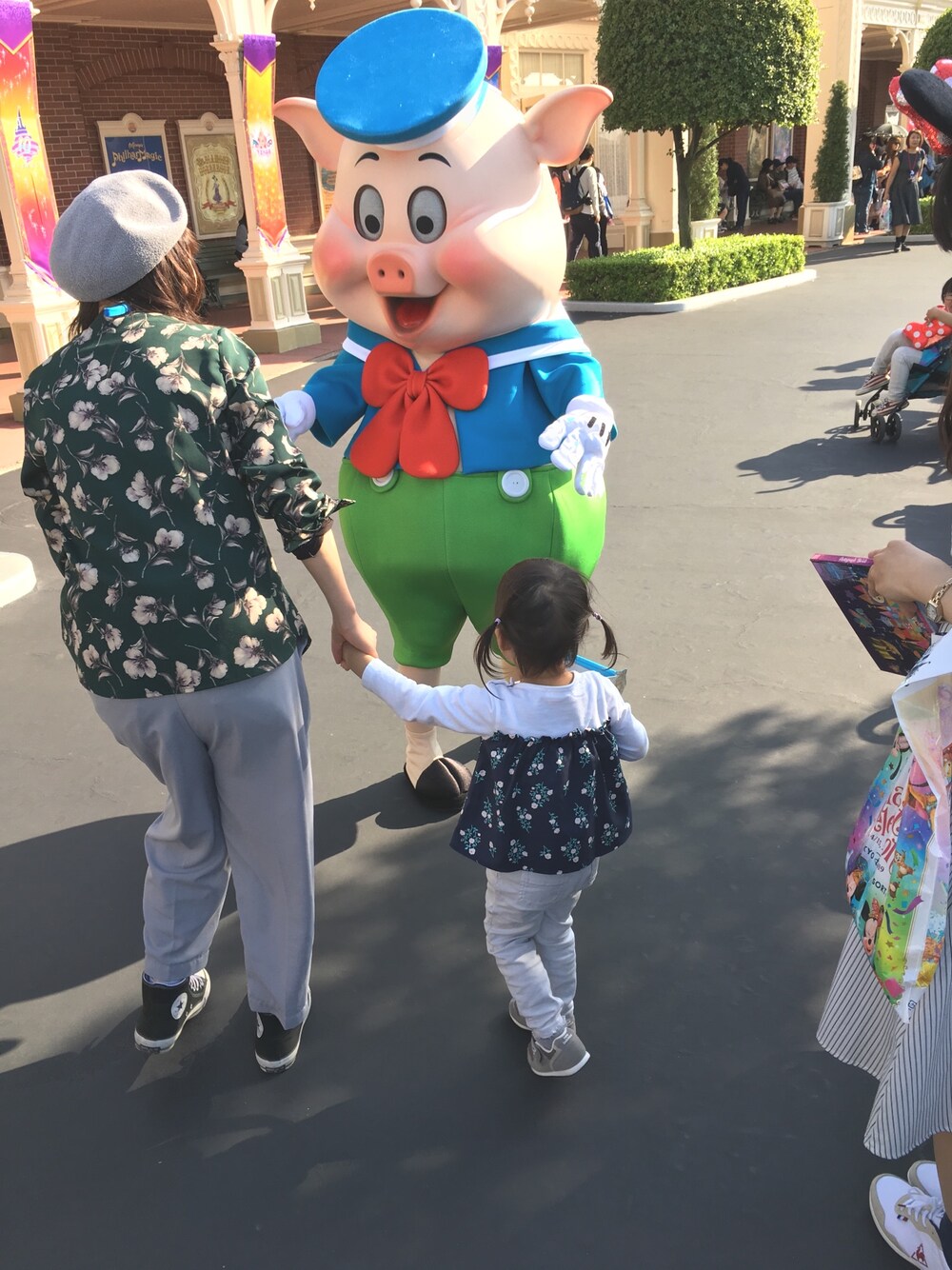 ディズニーランドで唯一写真を撮れたのはブタさんでした🐷 娘はドナルドと写真を撮りたかったようだけど捕まえられず。。(^^;; クッキーバニラのアイスがとってもおいしかったようです🍨