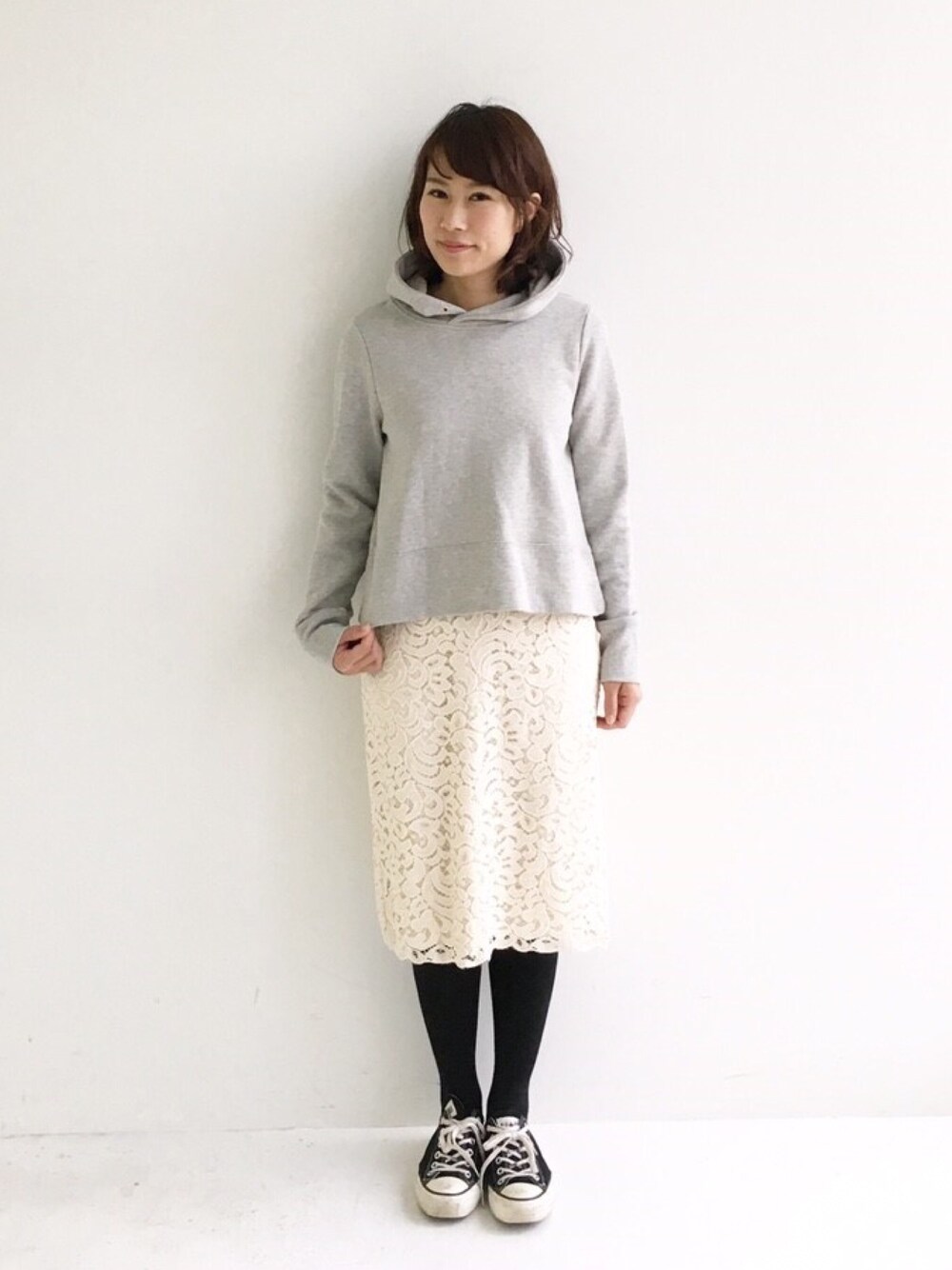 おはようございます! 今週も始まりましたねっ☆ いよいよ、日も長くなり、春がほのめいてます。 嬉しい限りですね!! 今日は春の新商品を着ました◎ まずはAラインのパーカー。 こちらしっかりとした厚手の裏毛が心地よく、 はりかんがちょっぴり出るのでちょうど良い感じです。 タイトなボトムスとの相性もよいので、 レーススカートが良い感じ♪ レーススカートは、ちょうどいいタイトさなので、 おしりがおっきく見えないのが◎ ひざが隠れるくらいの丈感もうれしいですね! さわやかなうすライトベージュのカラーと、パーカーのグレイは春らしく 整えてくれる色合いです。 今日はコンバースをはいたけど、 ヒールにしてもおとなっぽくてよさそう! 今週もがんばりましょー!