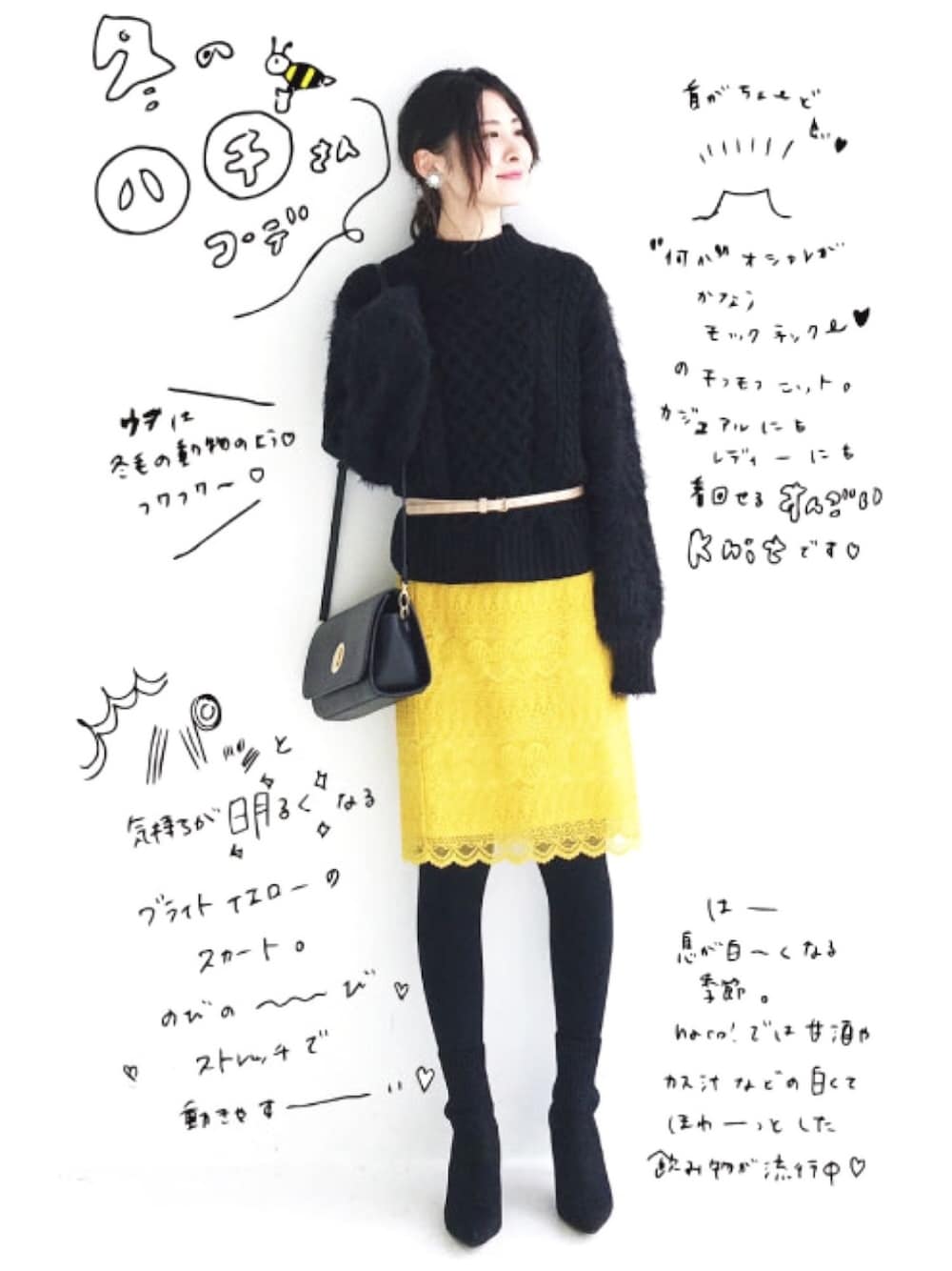 街で目をひく、冬の蜂さんスタイル。 もう1つのコーデも「赤と黒」。というコントラスト強めな配色でコーディネートを組んでみたのですが、こちらも「黄色と黒」のパッと目を引く組み合わせ。 どうしてでしょ~!なんだか冬(とくに真冬!)は、こんな「パッ」とした配色が気になる&チャレンジしやすいです。空気もぱっきりしているからかな~。キーンとしているからかな~。何はともあれ、このスカートとニットの組み合わせacoのお気に入りです^^ スカートは3サイズを履いていますが、大きかったので、くるんとウエスト部分を折っています。なので、もう少し長くも着ていただけますよ~♪そでがもこもこと動物のようにかわいいニットはモードにもコンサバっぽくも着られそうで、こっそり狙っています。 首元がつまっているので、カジュアルにデニムを合わせても、ちょっとおめかし感がでそう~^^。真っ白のワイドパンツとかにも合わせたいなぁ。グレーのワイドパンツと紫の靴とか、派手派手なバッグとか、思い切ったかっこもうまぁあああく丸め込んでくれそうです♪ ★★★★★★★★★★★ \ブログ やってます/ haco!WEBサイトで アラサー冒険家acoの 【Tender ロイン 素敵】 という記事を書いてます^^ プロフィールから 飛べますので よければどうぞ ★★★★★★★★★★★