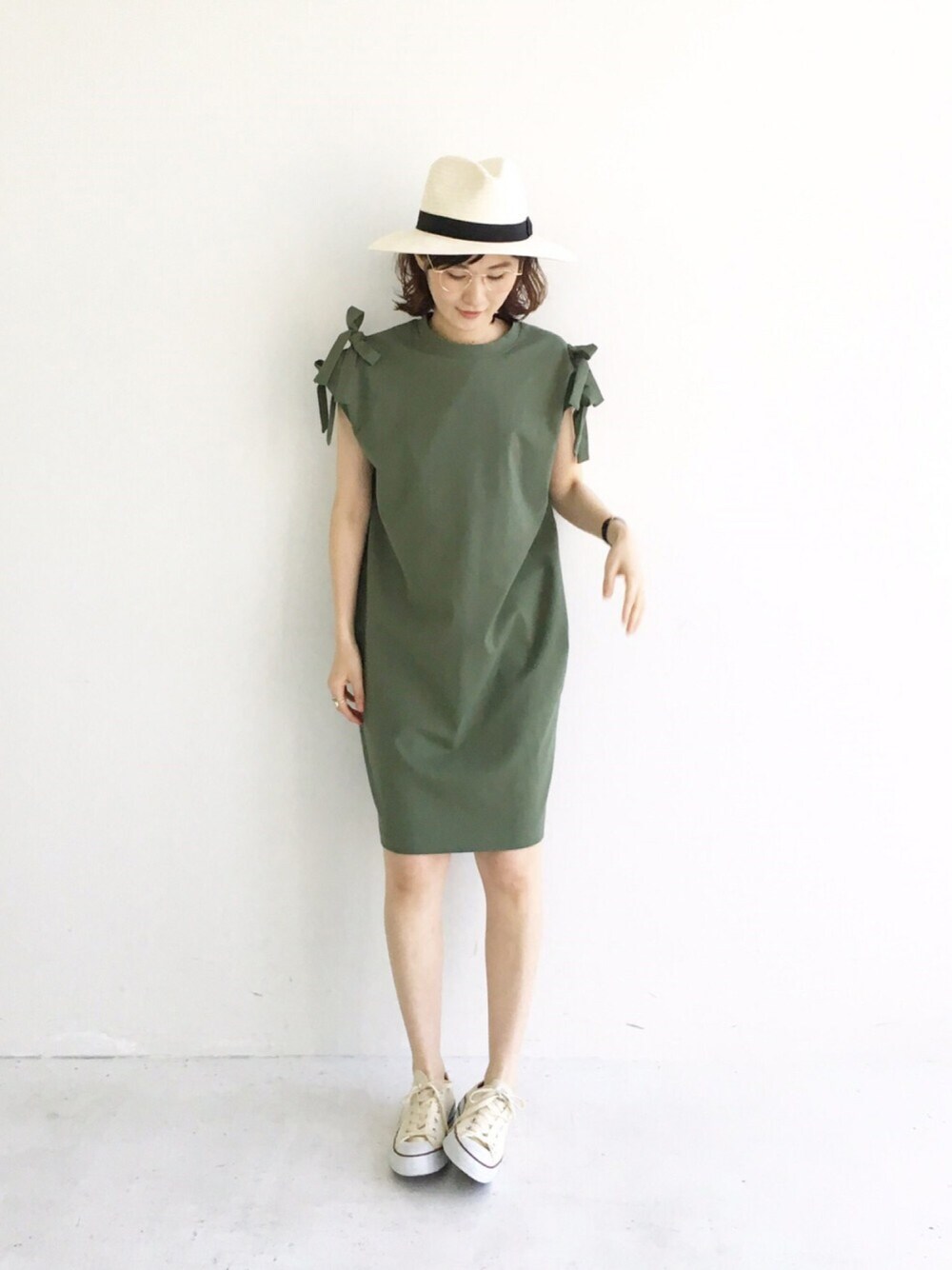 肩のリボンにかわいー!!となったワンピースです。 カットソーワンピースは、カジュアル好きな大人女子の味方のような気がします。 シワも気にせずに着られて、しかもポンチ素材なので、カットソーの中でもきれいな印象に着れるのが大人ポイントなのではないか。と思っています。 しかもしかも。このカーキ、なんだか色白にみえるかも。いや、みえないかな。 みえたと思いたいのだけど。 このワンピース。黒もあるのですが、黒は、さらにガーリーに着たい気分になりました。色ち買いしそうにっちゃった。 脚と腕を出すなら、首元はキュっとしているのがとっても好みです。