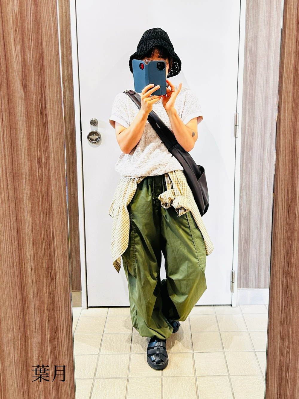 閲覧ありがとうございます✨ いいね、お気に入り、フォロー、とっても嬉しいです😆❤️❤️ 明け方は20°切って、昼間は30°前後な日が続いています。 去年よりは早い秋の到来な感じ🍂 コーデ。 ベージュのフレンチスリーブカットソー。 ↑しまむら。 シボ生地が大人可愛い😍 ベージュのチェックシャツ。 ↑アベイル。 薄手のメンズのシャツ。 腰巻きはもともと好きですが、今季は特に流行りらしいですね。 体温調節もできて🙆♀️ カーキのスーパーワイドカーゴパンツ。 黒のグルカサンダル。 黒のクロッシェバケットハット。 ブラウンのコクーンショルダーバッグ。 ↑GU。 ユニセックスアイテム。 色と素材で季節感➕🍂 このバッグ、形も可愛いし、紐の部分凝ってるし、斜めな入口の前ポケットが使いやすいしで、満足度◎✨