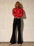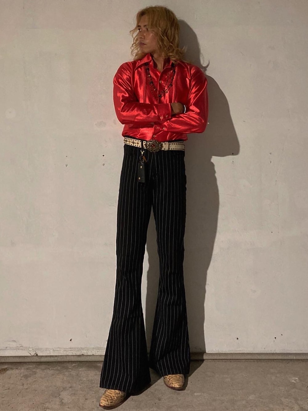 . すぐにでもディスコに行けるコーデ🕺 70年代らしい派手な色に裾が大きく広がっているフレアパンツ・ベルボトムを合わせて、足元はパイソン素材のウエスタンブーツ👢 タイトなシルエットで🤤 全て古着屋さんにて購入しました!