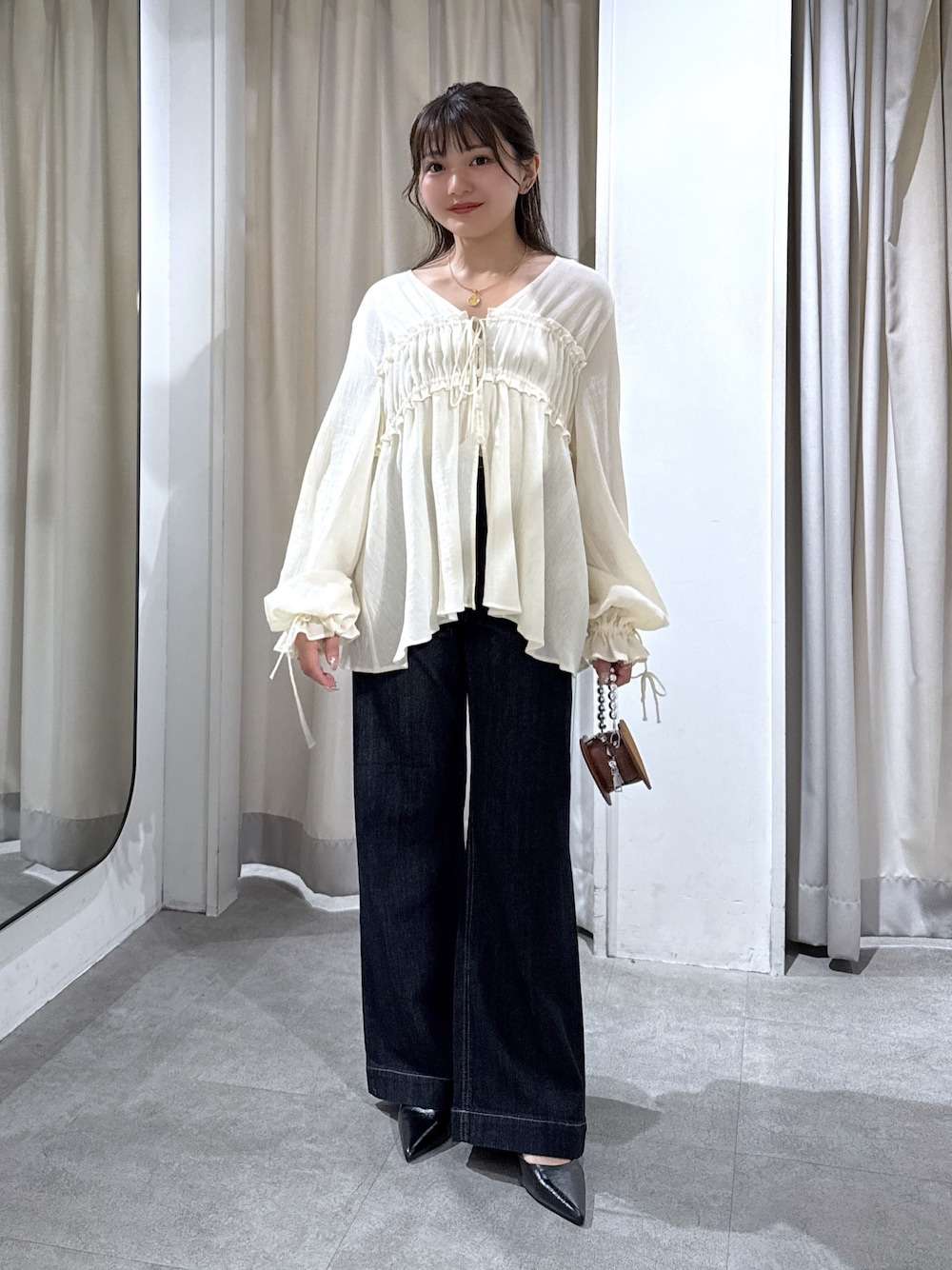普段サイズ:XS.S 足のサイズ:22.5-23.0cm、甲薄め 【Instagram】📨♡@h_kana43 【WEAR】🏷♡@hakana43 ✼••┈┈••✼••┈┈••✼••┈┈••✼••┈┈••✼ ・ブラウス(ホワイト/FRサイズ) 前がリボンなので羽織としても着られて、ヒップにかかるくらいの長さですがVネックなのでシルエットカバーしてくれてスッキリ着られます😘 ・キャミソール(ホワイト/FRサイズ) カップ付きでしっかりホールドしてくれて、ショート丈なのでクロップド丈のトップスのインナーにも着れます👍🏻✨︎´- ・デニムパンツ(ワンウォッシュ/XSサイズ) 床にすらない長さで、柔らかくて軽いデニム地です🐥ワイドの中でもスッキリ着れて、スタイル良く見せてくれます👖 ・シューズ(ブラック/Sサイズ) 高すぎないヒールで、先端が細めですがクッションが柔らかく効いているので歩きやすいデザインです👡✨️