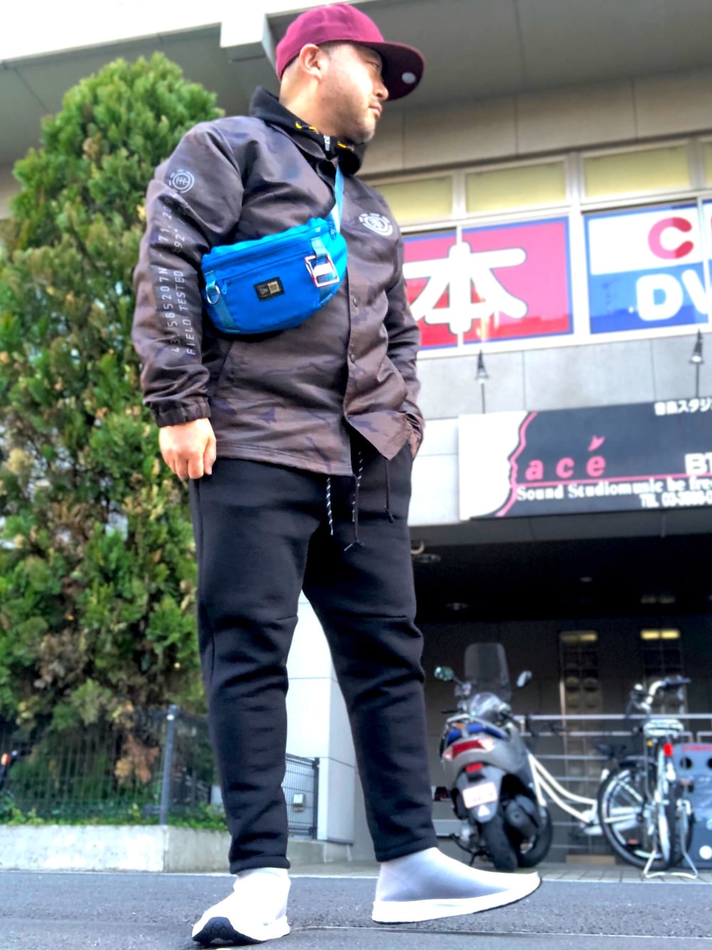 キャップ、ボディバッグはニューエラ 、コーチジャケットはかなり厚地のエレメント!これなら風をバッチリ防げる。