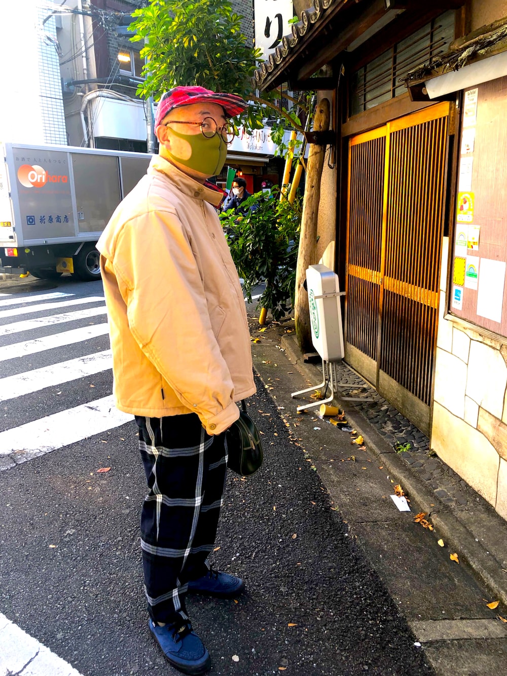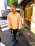ピザ食べに行く時のコーデ! 裏地の赤チェックとキャップの赤チェックを合わせてみました。
