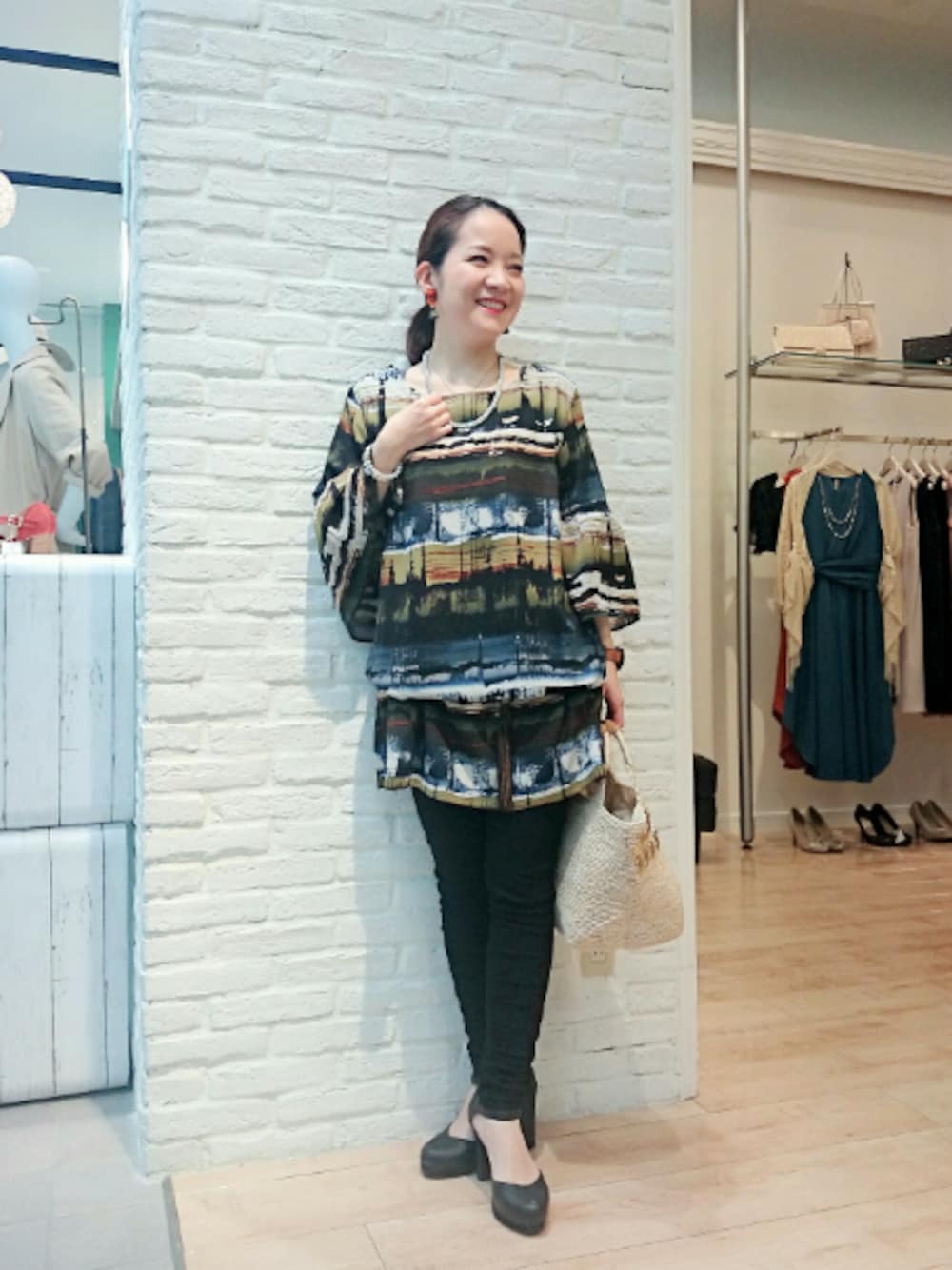 アフリカンテイストのワンピースを チュニック風にブラウジングしたコーデ🌸 小柄なスタッフでも パンツ合わせでバランスよく styling出来てます👍 お袖のふんわりデザインが 今年らしい雰囲気でお召し頂ける一枚🎵 個性的なプリントがお好きな方、普段と印象を変えたい方におすすめです👧