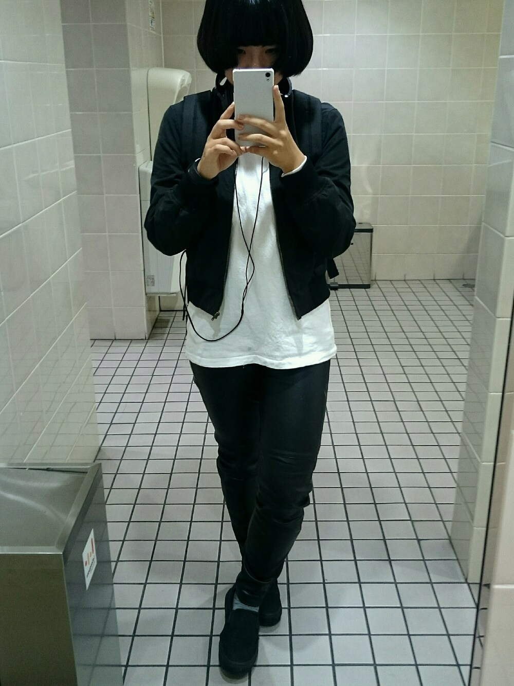 grnのTシャツ メンズのMで袖長めなのが好き レザーパンツ初めて履いた~暖かい あ、バックパックはヘルスニットです