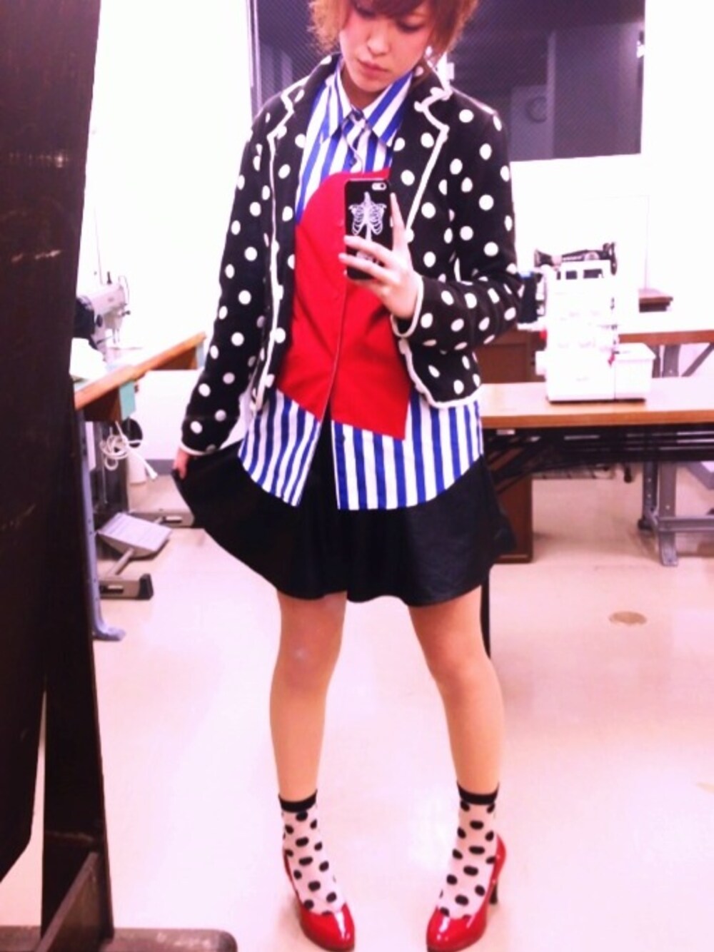 ドットジャケット→ANAP ハートストライプシャツ→MILK BOY フェイクレザースカート→不明 ドットシースルーソックス→GU パンプス→古着 昨日のコーデです。