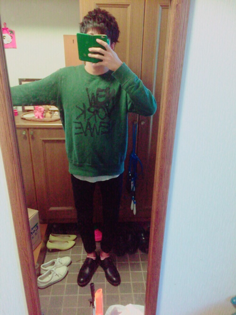 スウェットだけだと物足りないと思い、下にロング丈タンクトップを着ました。 今日はゆるめにしつつ、黒スキニーと黒の革靴でひきしめました( ˘ω˘ )