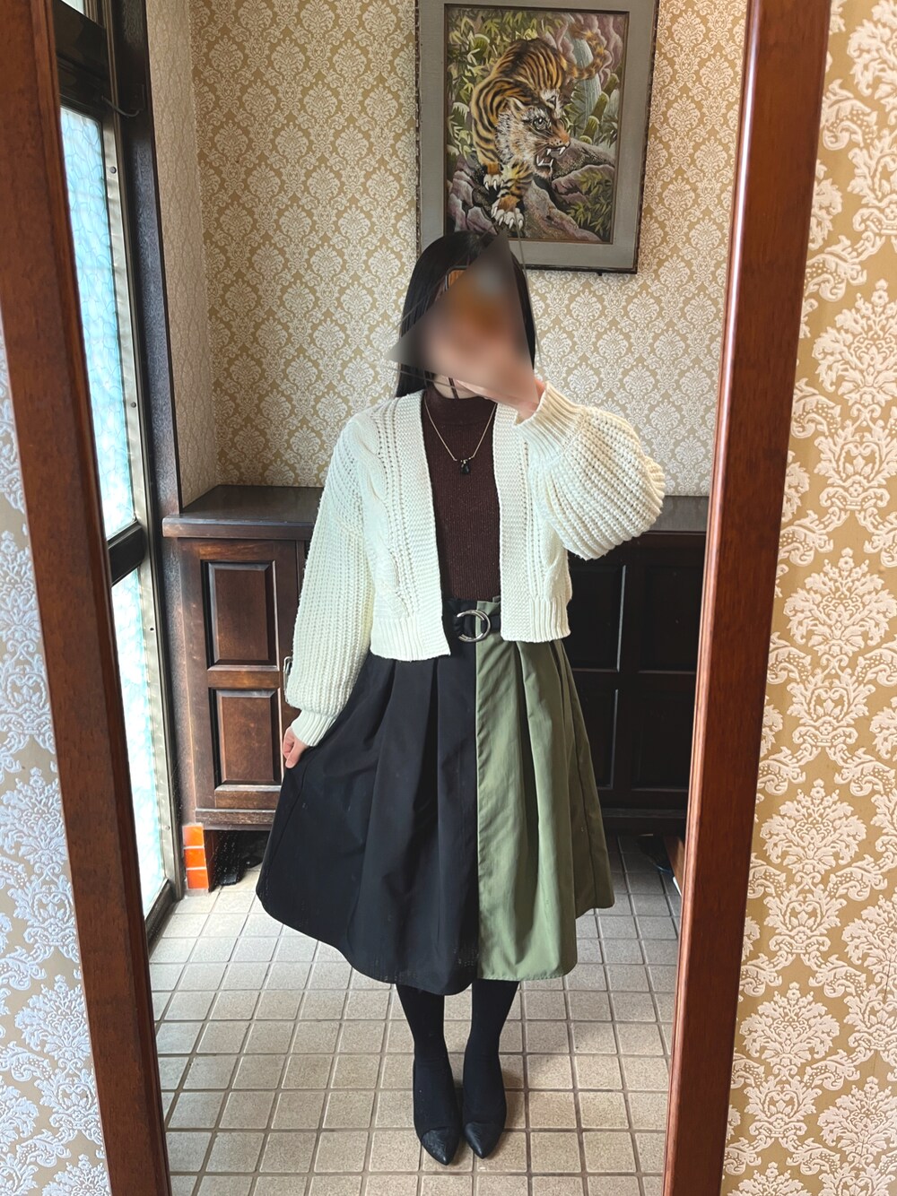 トップスもカーディガンも袖にボリュームがあるのがお気に入り ウエストマーク×短めカーディガンが何年経っても好き ネックレスとスカート、どちらも縦に2色ずつというこだわり