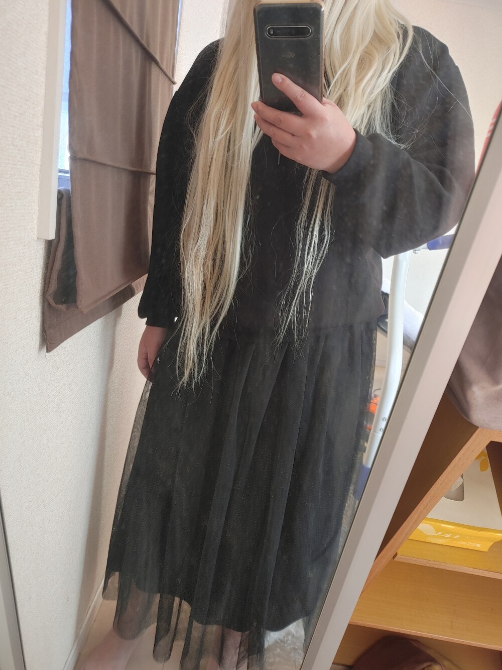 上下ちゃくちゃくちゃくのコーデ 黒パーカーと黒チュールスカート