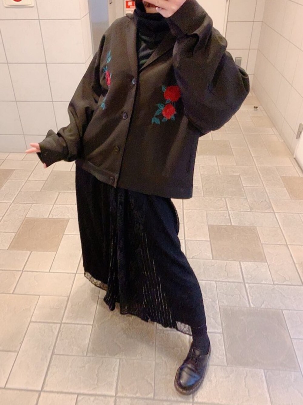 HAREのアウターは薔薇刺繍が気に入って買ったのと肩落としで着れる所が◎ スカートはレース刺繍の部分とシルバーラメのミックスになってる所が好きです