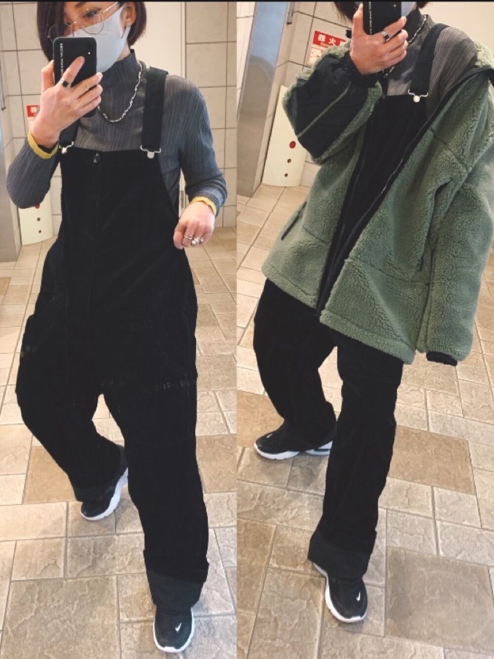 ダボダボのオーバーオールにフィット感のあるトップスでバランスとりました