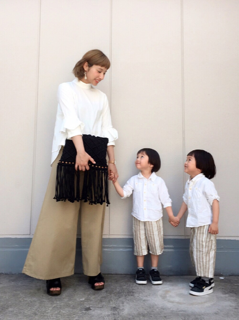 親子コーデ ナチュラルカラーでリンク♡ シンプルになりすぎないようにデザイン性のあるアイテムを取り入れてコーデしました(^^)
