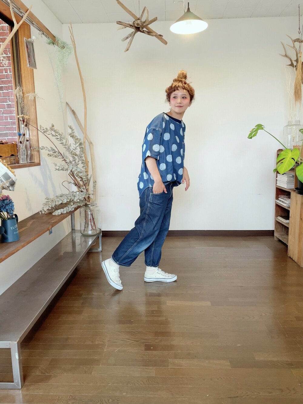 花屋になりたくてのTシャツ/カットソー「抜染ドットプリント デニム クルーネック Tシャツ」を使ったコーディネート