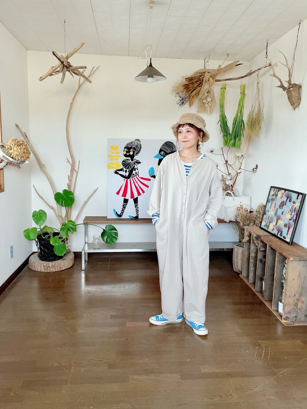 花屋になりたくてのワンピース「綿麻クルーネックオールインワン」を使ったコーディネート