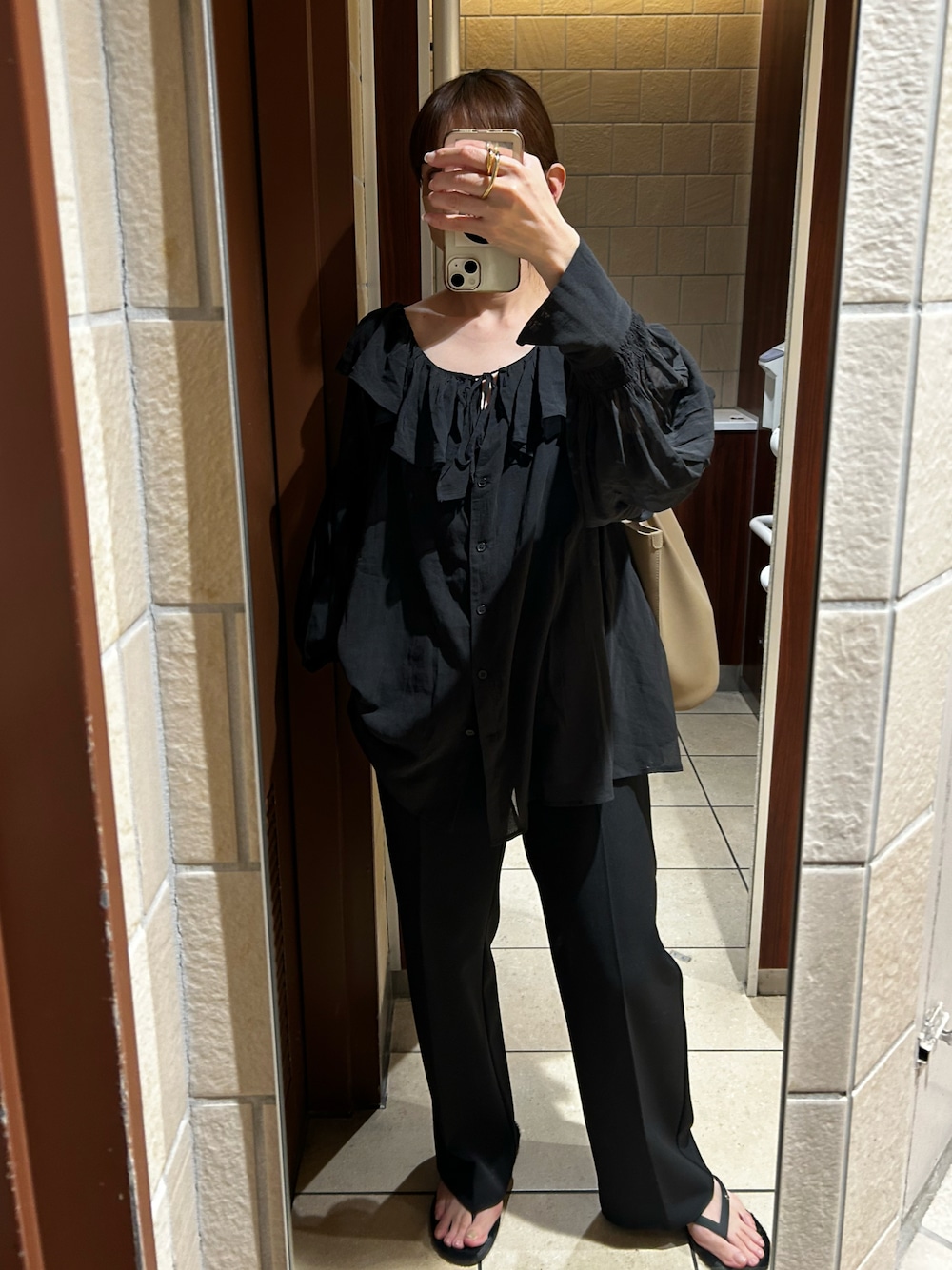 フリルで甘くなるのは苦手だけどこのブラウスは襟のあきが広くデコルテがキレイに見えるからフリルでも大人が着れるブラウスでお気に入り😌