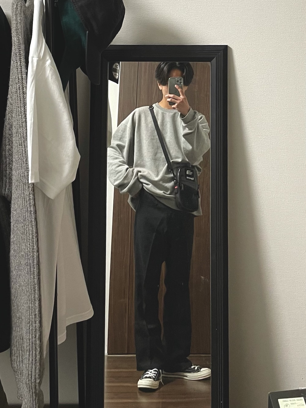 古着のfruit of the loomのスウェットにグローバルワークのちょいフレアにctのハイカットです。 バッグはシュプノースのレザーのショルダーバッグです。
