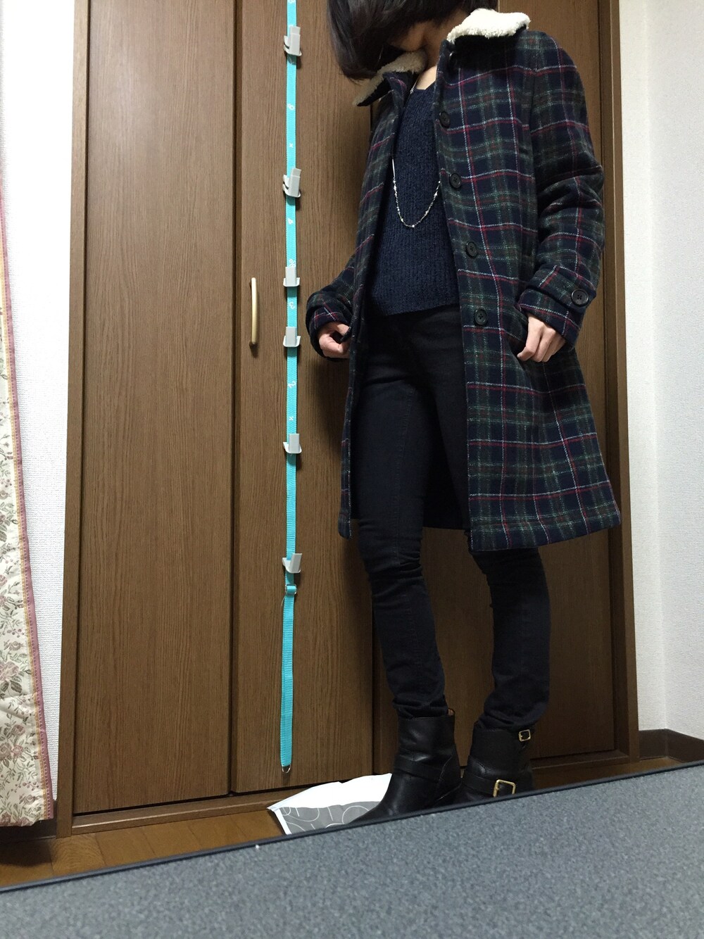 黒スキニー好きです。 普段はこんなシルエットばっかり。 柄物のコートは人生初。最近のお気に入り。