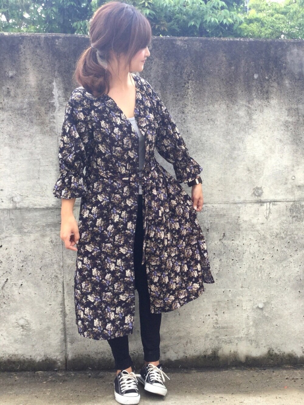 ブラック系のスニーカーを着用したレディースの夏コーディネートの1枚目の写真