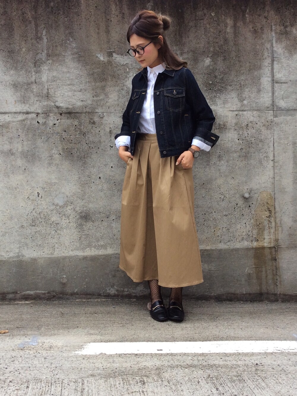 ベージュ系のアナログ腕時計を着用したレディースの秋コーディネートの1枚目の写真
