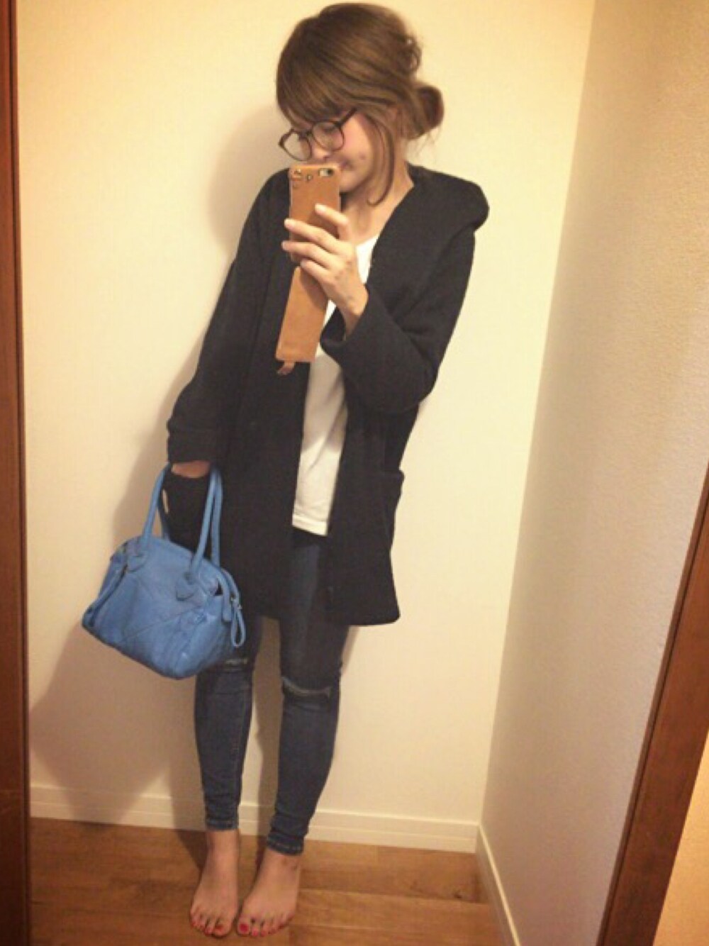 ブルー系のデニムパンツを着用したレディースの秋コーディネートの1枚目の写真