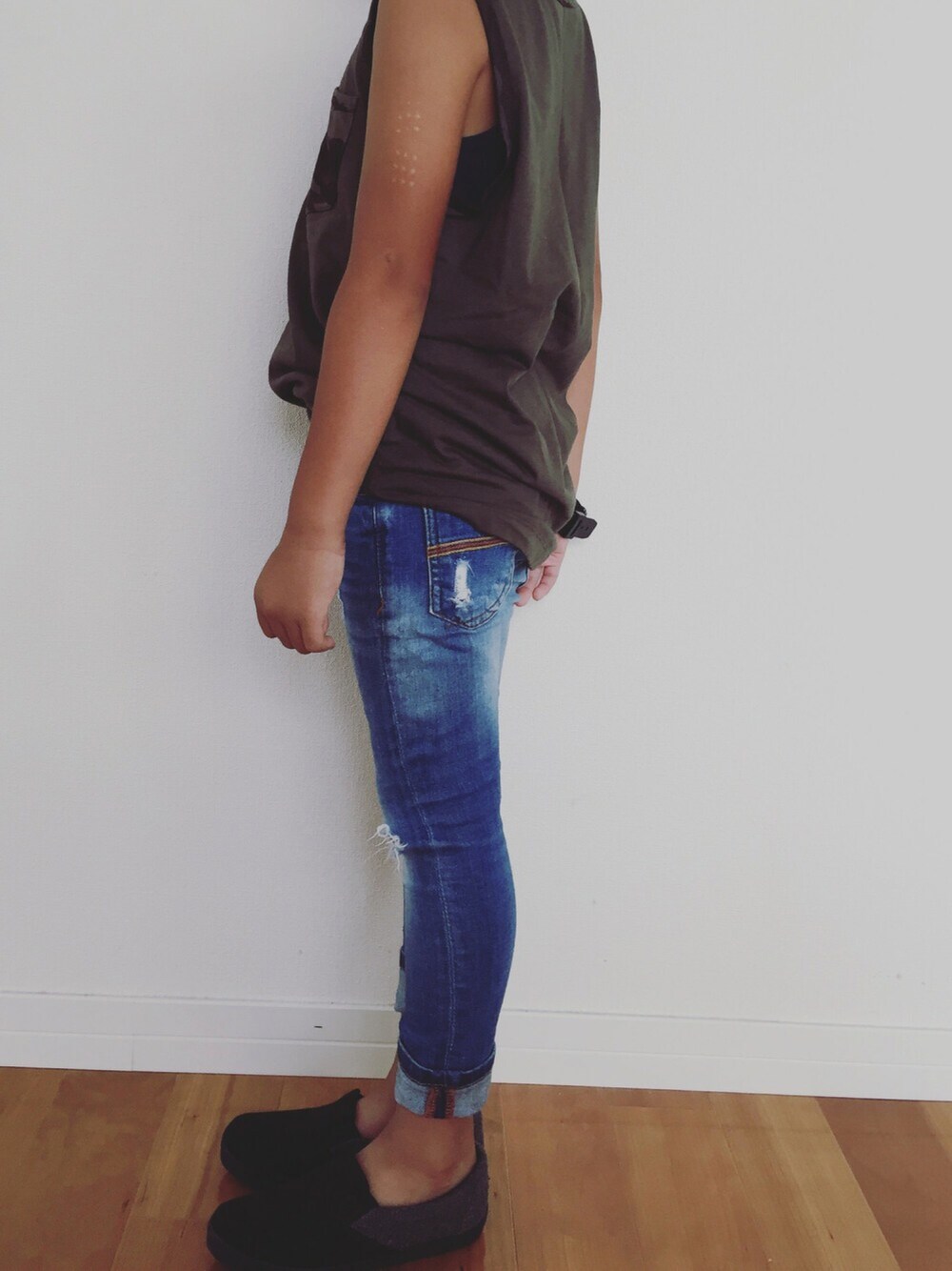 ブルー系のデニムパンツ、ブラック系のシューズを着用したキッズの夏コーディネートの1枚目の写真