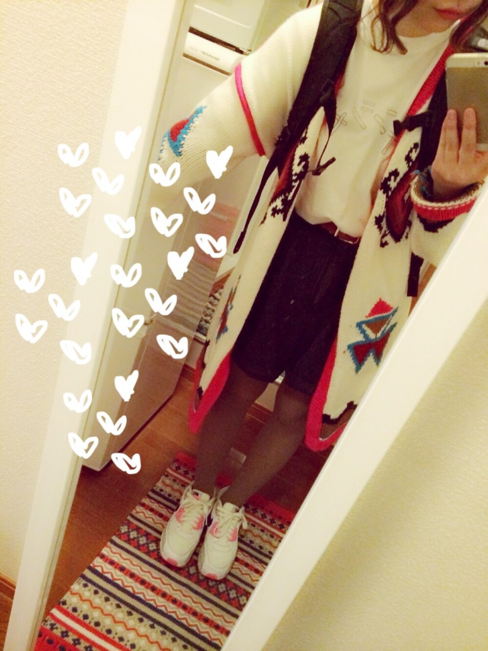 Tシャツ、シャンシャンって書いてます。🔔 キュウソネコカミのセイヤさんとおそろいなんです。笑 新入りさんのニットのアウター かわいくてあったかくて おきにいり(o^^o)❤️❤️ いっぱい着る〜〜〜!